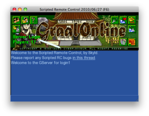 The Scripted RC is an in-game utility that allows administration of Graal servers without needing to download extra software. It supports most of the functionality of the external RC, including editing attributes, rights, bans, uploading and downloading files, adding, removing and editing NPCs, etc.
